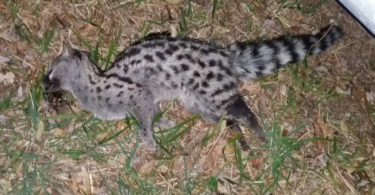 Walking back from the supermarket along the horrid, busy road we passed a very strange animal, unfortunately deceased at the side of the road. It was cat like in form but with a very narrow face, bushy tail and distinctive markings. Does anyone know what it is?