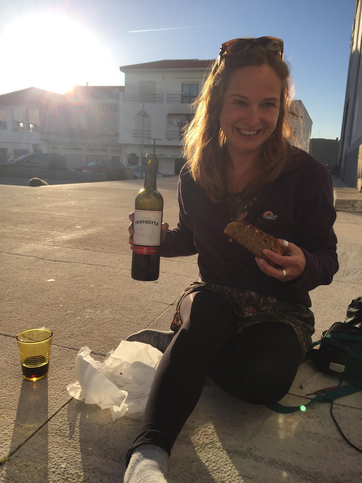 Me and my new friend Jolien decided to take a meander in to ‘town.’ Aljezur was sleepy so we made our own entertainment – the finest wine available to humanity, and cake!