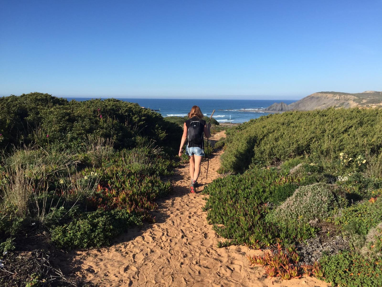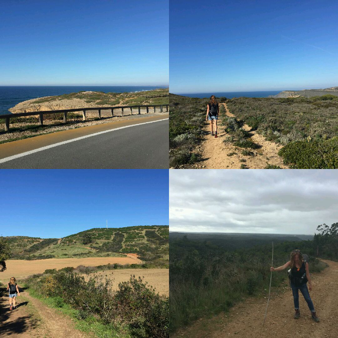 Using Google maps we tried to shortcut across the wilderness to find a road we could hitch home on but we came across the steepest of steep slopes and for a moment we wondered if we maybe should have just headed backwards along known tracks to road we saw a few km back…. But no! Forwards we inched, sticks to keep us upright, then up, up, up and suddenly the path was familiar. We were back on a track from this morning. We had made our own circle. A guy out foraging had his car and we hitched from an unlikely spot, off road, back to Aljezur, stopping to buy well earned pizzas, chocolate desserts and crisps en route.