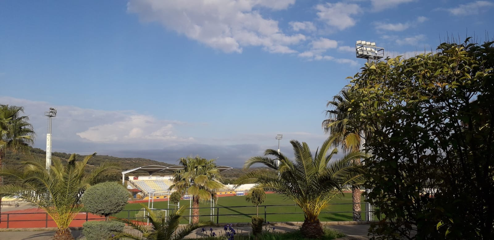 We strolled out of town passing the town’s football stadium. Tom was impressed – the fans of Monesterio were very fortunate! Fantastic green grounds with palm trees and lush plants. From the grandstand the views of the countryside all around would be great regardless of the match….
