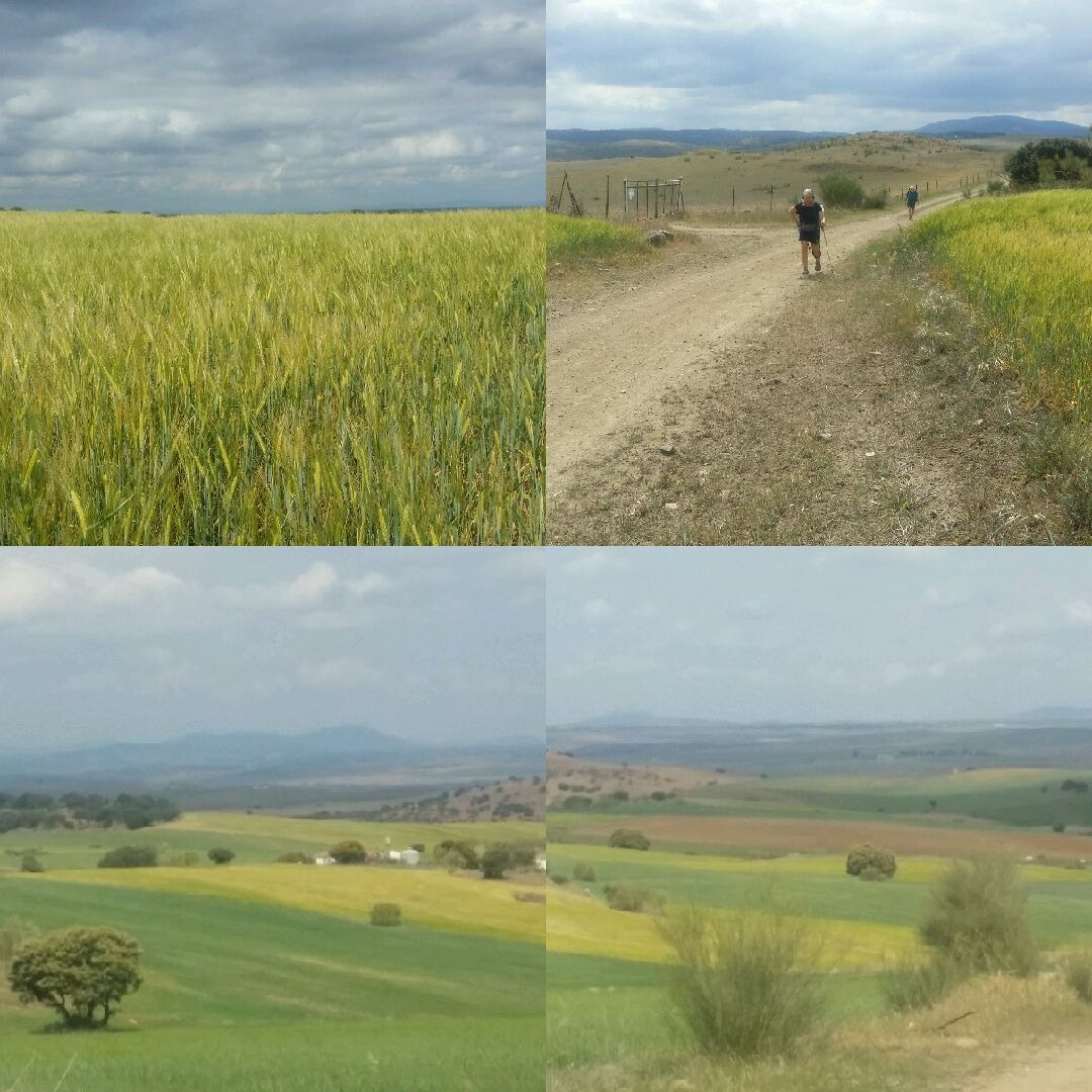 We woke up at 7:30, or was it 8:30, or even 6:30…?? No one was sure. We had heard it was the day of the hour change but no-one seemed to know whether we should be going forward or back… We were all confused…. Were we up early or late? There did not appear to be any pilgrims about yet so maybe it was only 6:30? We look a relaxed breakfast of apple and blueberry porridge and copious cups of coffee. Still there were no pilgrims about…. maybe we were up late, maybe they were gone….! Had it been it 8.30….? I’m still not sure what direction the clock had gone in – all I know is it 12:30 now… We bumped in to James and Arri from Australia who we’d briefly met on our first night. We suspect Arri was the grumpy coffee man but can’t be sure. Anyway, neither seem grumpy any more, in fact, they’re both rather fun characters, noisy and excitable. We found them standing at the side of the road, waiting for a taxi. They were headed back to the next town, having arrived there yesterday to find they were staying in the worst hostel in the world, ran by a dirty, rude and grumpy man – sitting ducks for his despicable menu of roadkill stew, or worse… James suspected the owner may be the Sweeney Todd of Camino…..They had escaped in the night, taxi-ing back to Monesterio. They warned us not to stay in the dreaded, filthy Los Rodriguez Hostel in Calzadilla de los Barros (27km form here…. ) so we decided to head to Fuente de Cantos instead.