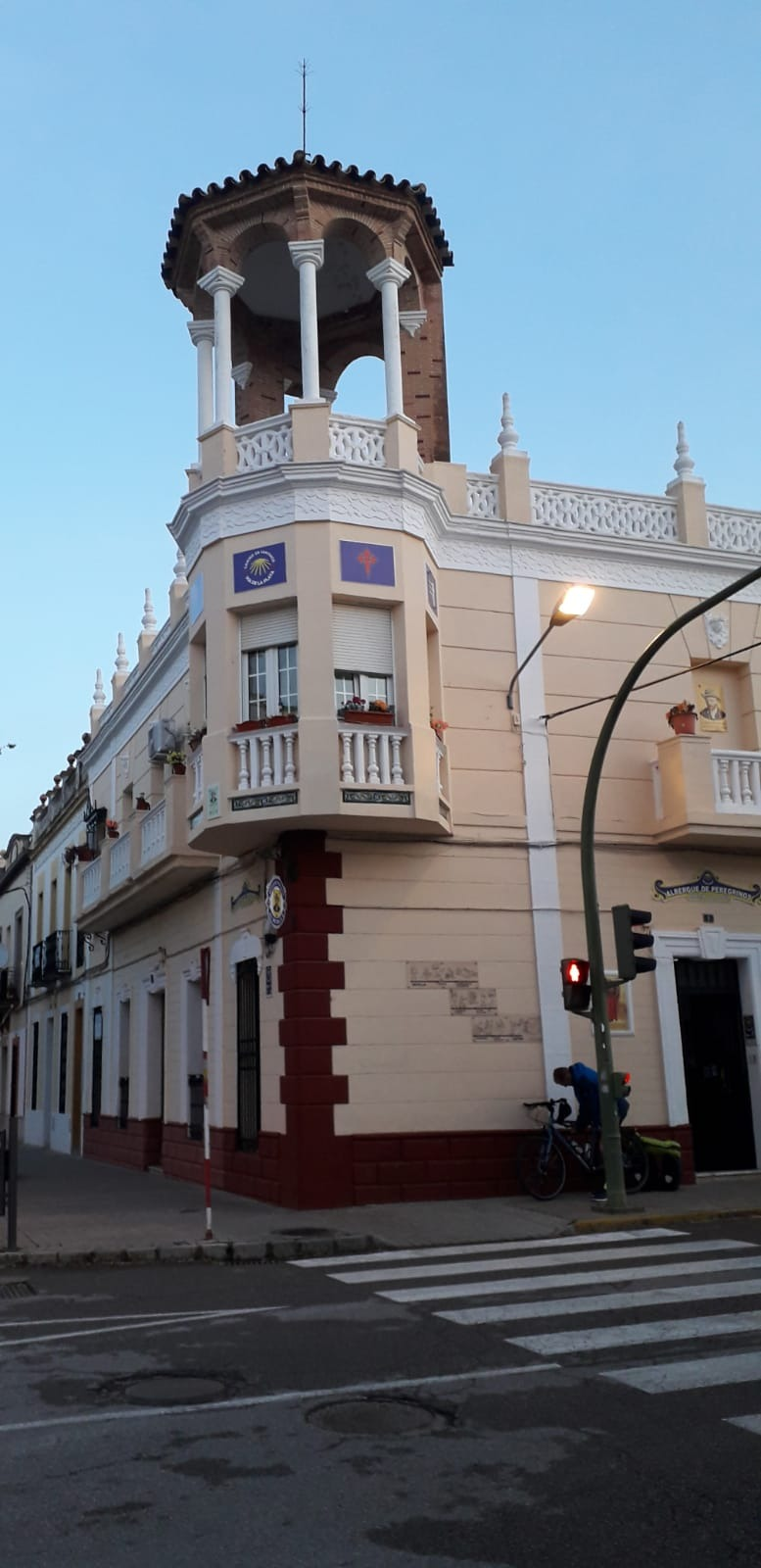 Sick but happy, we continued on. The path widened and took us through open countryside, fields of crops and smallholdings, before leading us in through the small town of Pueblo de Sancho Perez, and then along busier roads in to the larger town of Zafra. Just as the threatened rain arrived we spotted the only albergue in town Albergue Van Gogh.