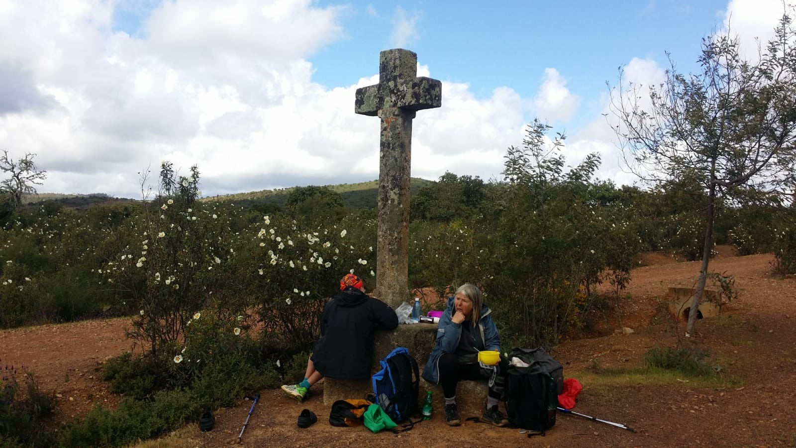 The grey farmland grew rockier and pretty flowers appeared, bunches of yellow and purple blooms, brightening the scenery and cheering our moods. The clouds were not welcome here! The sun made an appearance and we took our opportunity to eat our packed lunches -tuna pasta salad, sat around an ancient stone cross with a built in table ledge.
